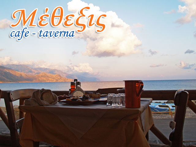 Μέθεξις, όπως λέμε επικοινωνία… Η φιλοσοφία μας όπως και στα περισσότερα εστιατορια στην Κρήτη, είναι πολύ απλή. Καλή Κρητική παραδοσιακή κουζίνα. Καθημερινά θα βρείτε πάνω από δέκα διαφορετικά πιάτα από μαγειρευτά. Όλα φτιάχνονται με ντόπια αγνά υλικά. Είναι αυτό που δεν μπορείς να πεις με λέξεις…